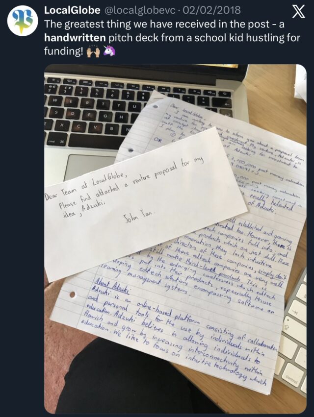Around that time, I also remember sending handwritten letters to venture firms across London for another education start-up called Edzuki (formerly Adzuki). It was my way of dipping my toes into the fundraising world and understanding what it would take. These early experiences shaped my interest in start-ups and showed me how ideas can become products and services people genuinely find useful.